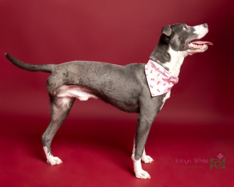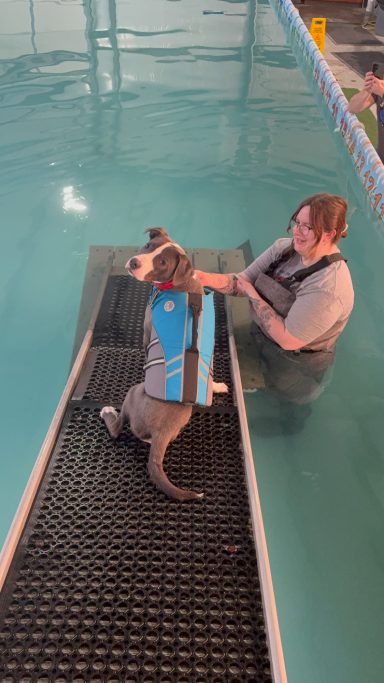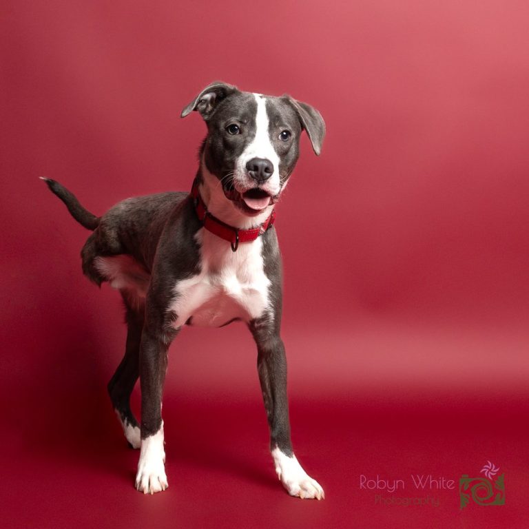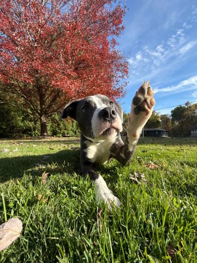 This happy pup came to us with a fractured femur that required amputation. He has never let that slow him down spends his days running and playing with his dog and cat foster siblings. He is ~1 year old and weighs 37lbs. Mako loves to snuggle, play tug, and has recently started learning how to dock dive!