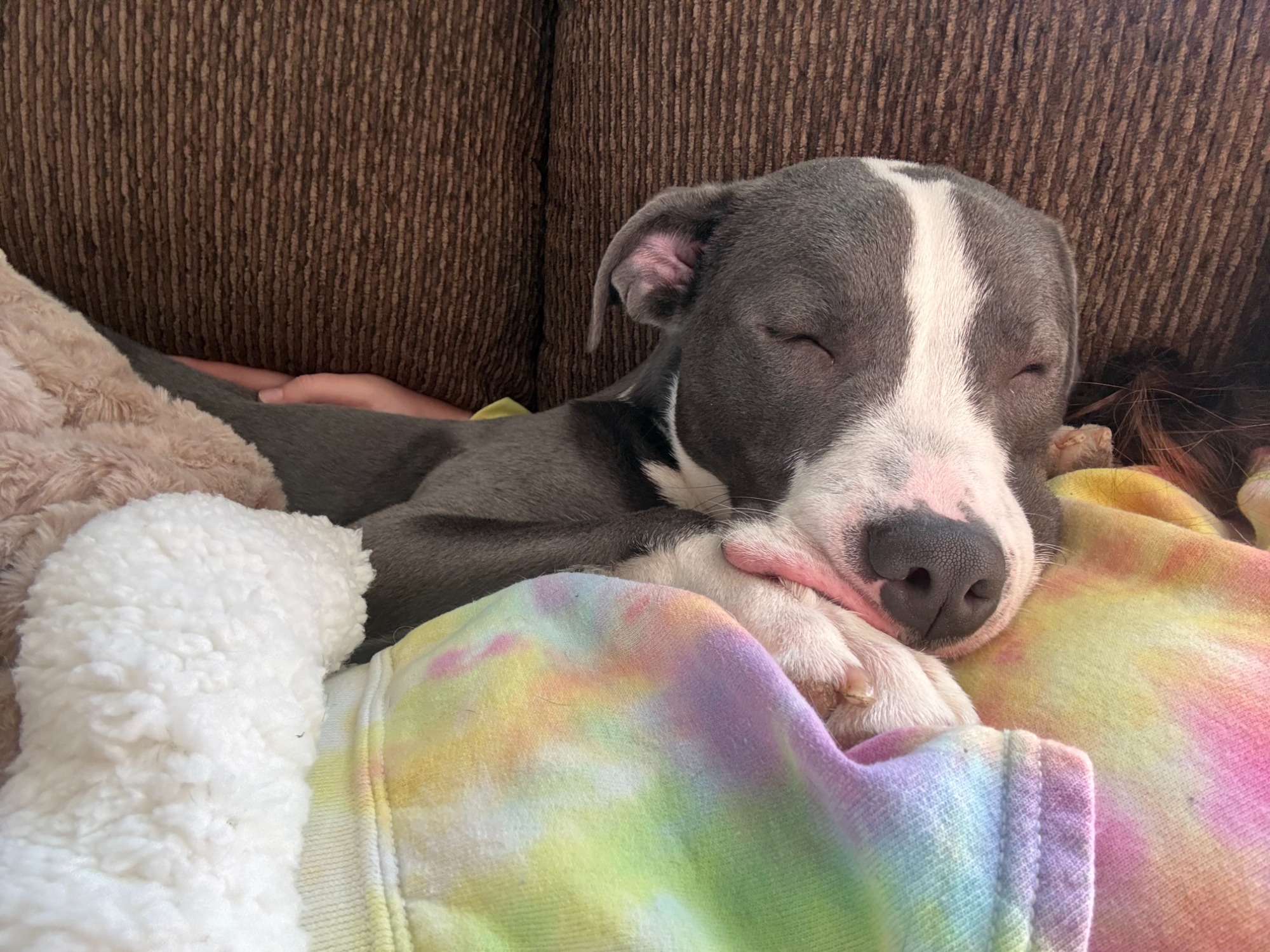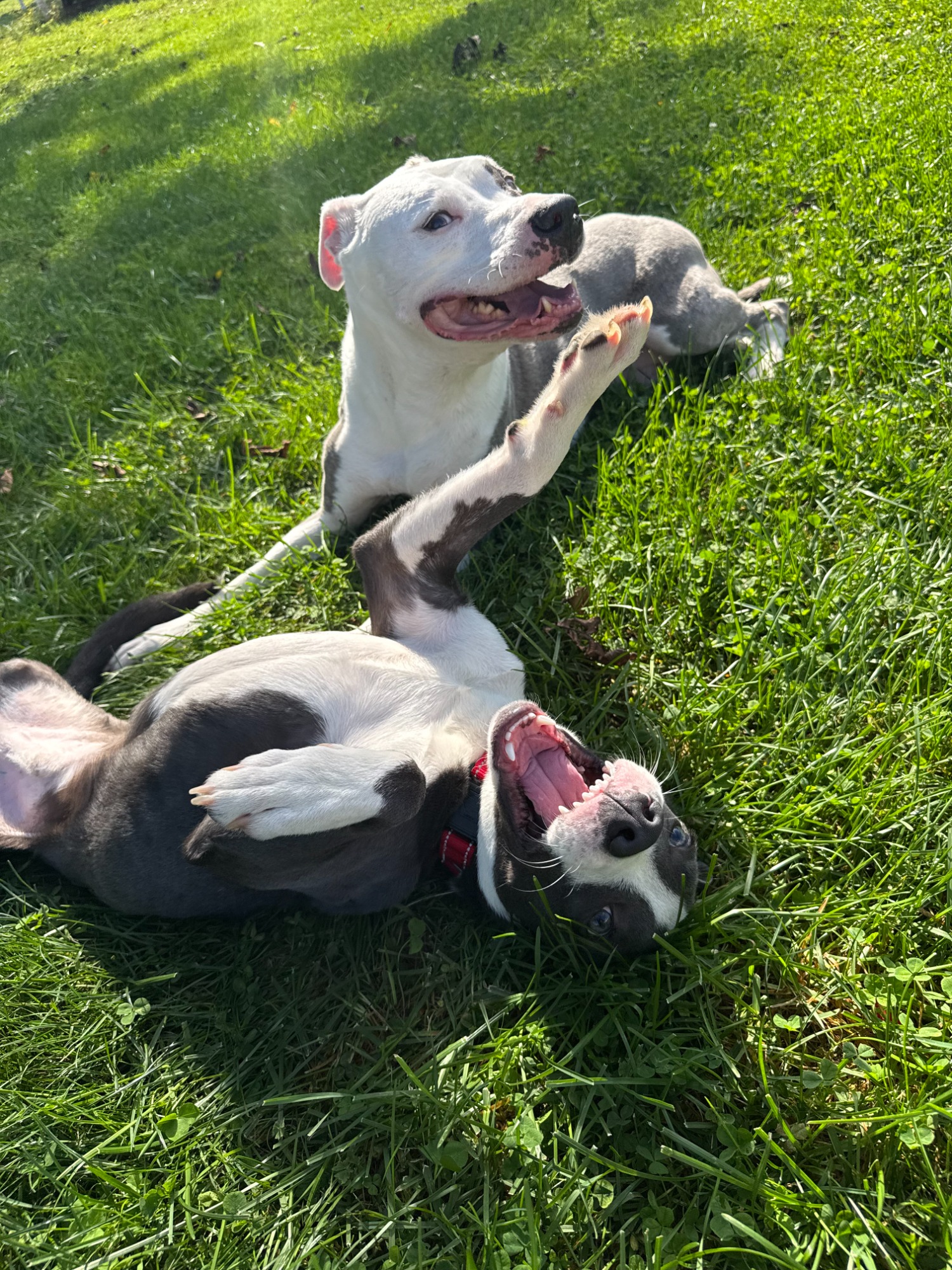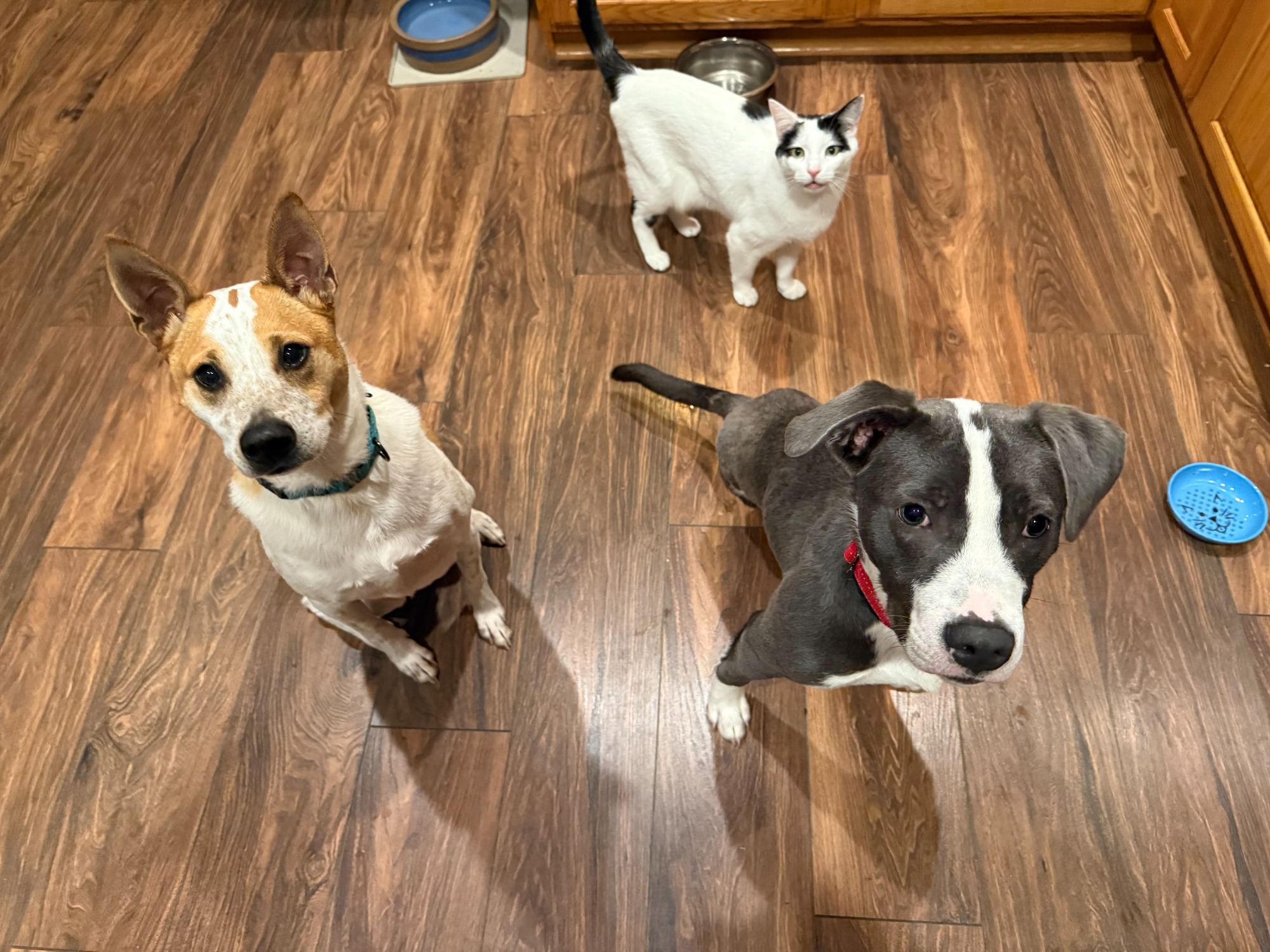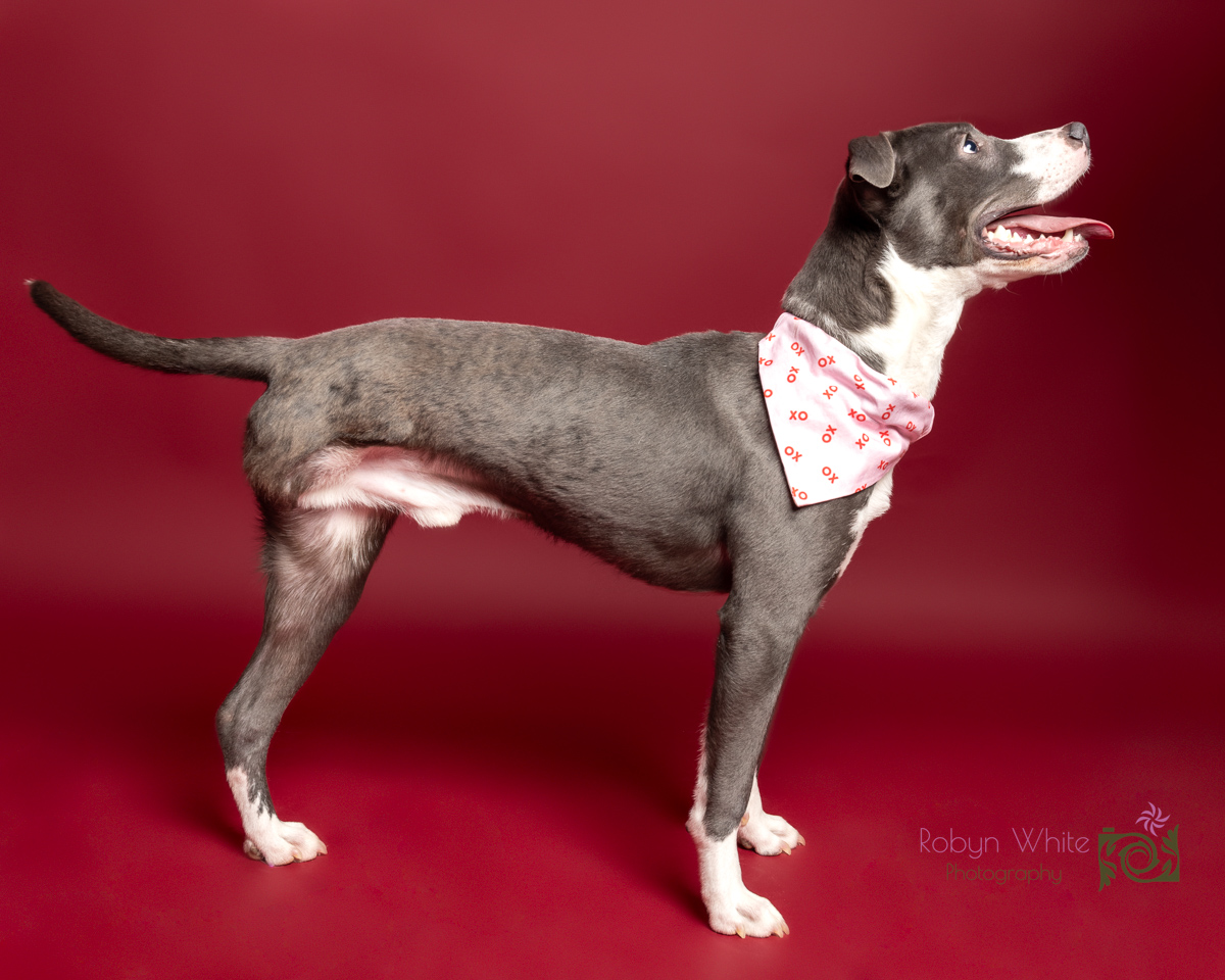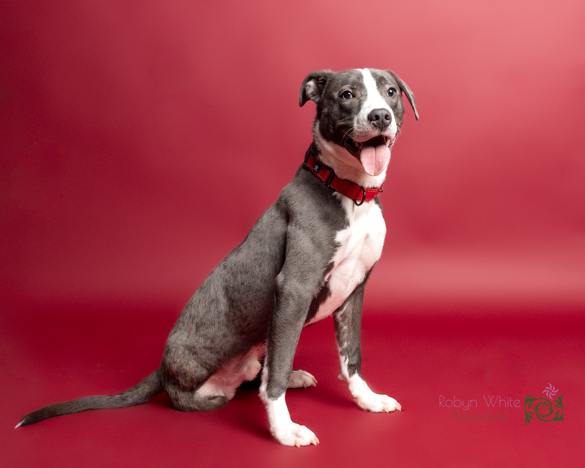 This happy pup came to us with a fractured femur that required amputation. He has never let that slow him down spends his days running and playing with his dog and cat foster siblings. He is ~1 year old and weighs 37lbs. Mako loves to snuggle, play tug, and has recently started learning how to dock dive!